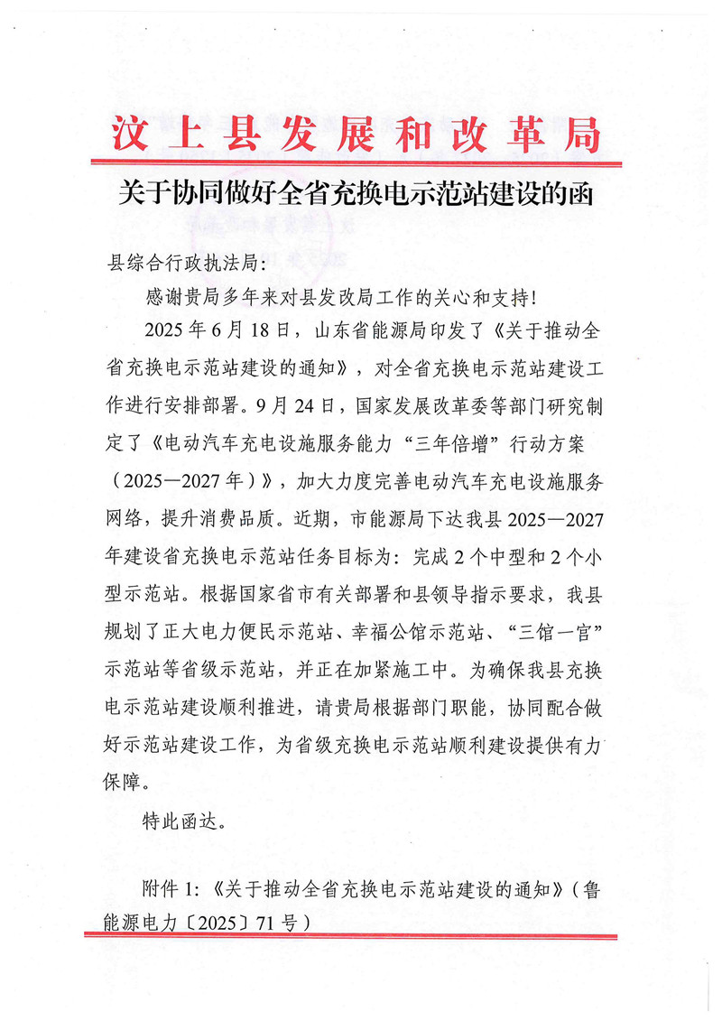 感謝貴局多年來(lái)對(duì)縣發(fā)改局工作的關(guān)心和支持!2025年6月18日,山東省能源局印發(fā)了《關(guān)于推動(dòng)全省充換電示范站建設(shè)的通知》,對(duì)全省充換電示范站建設(shè)工作進(jìn)行安排部署。9月24日,國(guó)家發(fā)展改革委等部門(mén)研究制定了《電動(dòng)汽車(chē)充電設(shè)施服務(wù)能力“三年倍增”行動(dòng)方案(2025-2027年)》,加大力度完善電動(dòng)汽車(chē)充電設(shè)施服務(wù)網(wǎng)絡(luò),提升消費(fèi)品質(zhì)。近期,市能源局下達(dá)我縣2025-2027年建設(shè)省充換電示范站任務(wù)目標(biāo)為:完成2個(gè)中型和2個(gè)小型示范站。根據(jù)國(guó)家省市有關(guān)部署和縣領(lǐng)導(dǎo)指示要求,我縣規(guī)劃了正大電力便民示范站、幸福公館示范站、“三館一官’示范站等省級(jí)示范站,并正在加緊施工中。為確保我縣充換電示范站建設(shè)順利推進(jìn),請(qǐng)貴局根據(jù)部門(mén)職能,協(xié)同配合做好示范站建設(shè)工作,為省級(jí)充換電示范站順利建設(shè)提供有力保障。